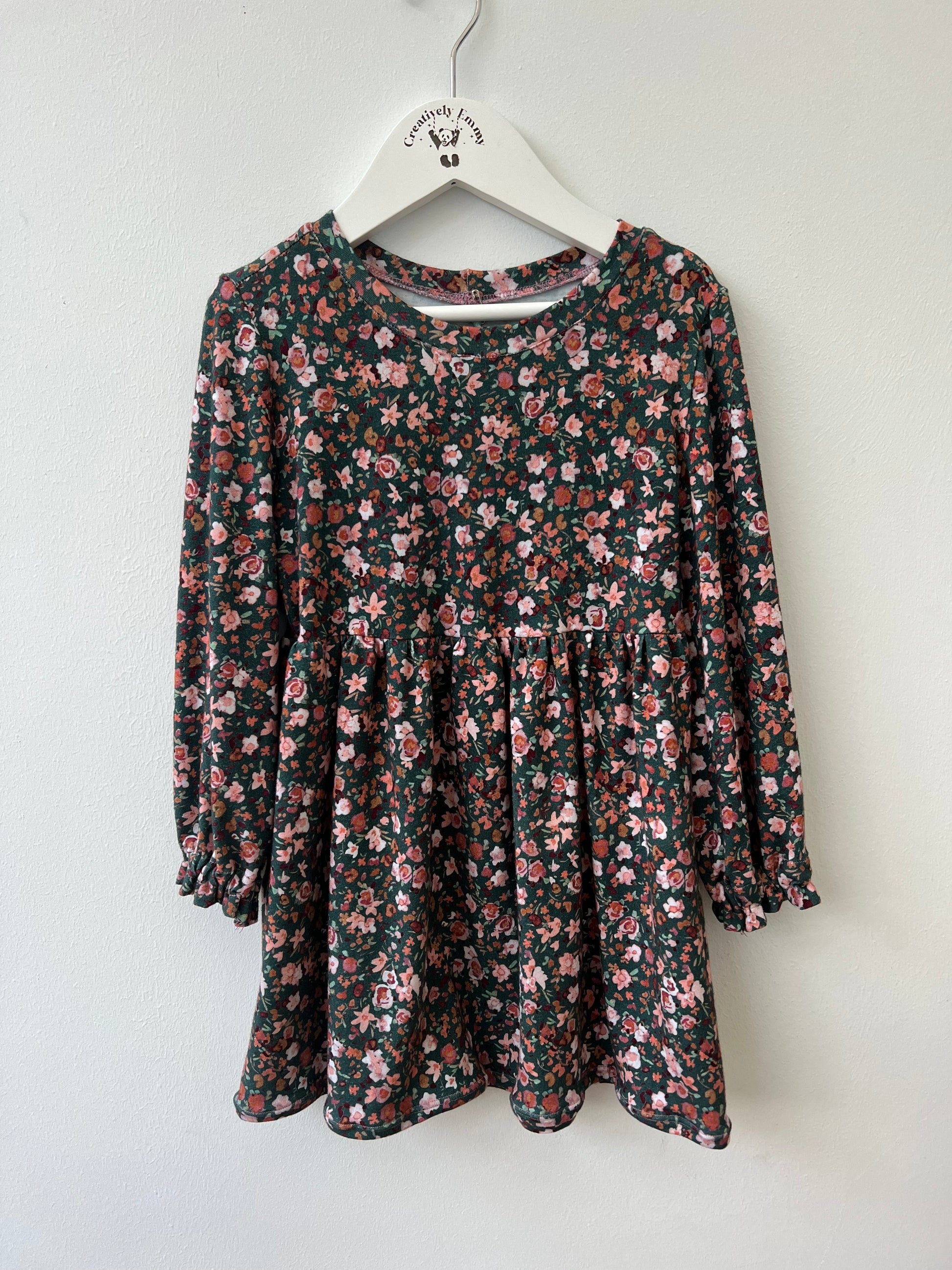 Made-to-order: Floral Long sleeve knee length dress with ruffled elasticated cuffs and a gathered waist. Cotton Jersey fabric (95% cotton, 5% elastane